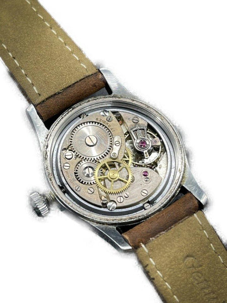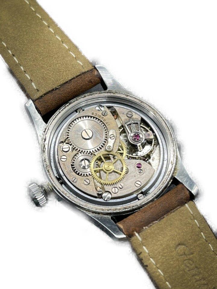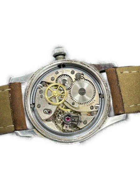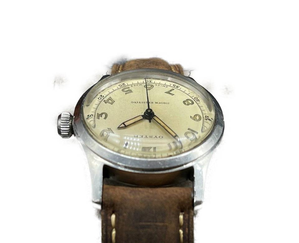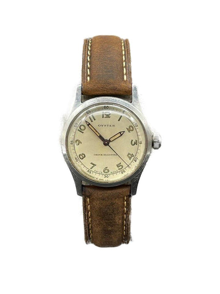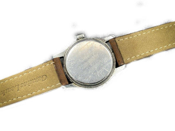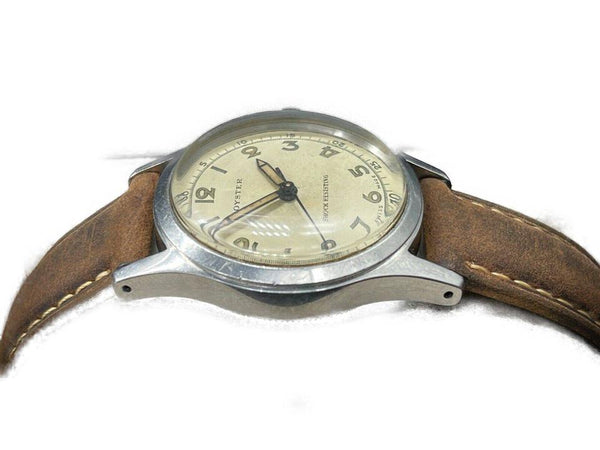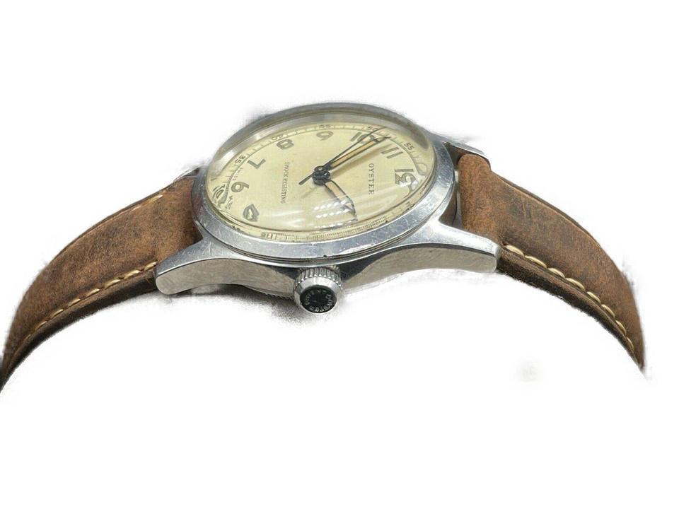 Date Code/Serial Number: 363205 Measurements: Length: 9.5 " Width: 3.5 " Height: 9.5 " Circumference: 5.2" - 7.2" OVERALL VERY GOOD VINTAGE CONDITION ( 7/10 or B ) Accessories: Watch Pillow Manual Wind Signs of Wear: Exterior Leather and Trim: Minor Darkening Handle / Straps: Minor Darkening Edges: Minor Scratches Hardware: Some Scratches Vintage and original Oyster - Rolex Watch Company Ref. 4453 in a stainless steel case, featuring the 17-Jewel manual-wind movement. This Oyster-RWC is in good working order; winds and runs like a champ. The original dial is gorgeous with a nice uniform patina on the dial, hands, and numerals. The crystal is clear and free of scratches or mars. The stainless steel case is unpolished and unrestored. It shows light wear consistent with age. The original Oyster Patent crown is present and screws down tightly. Includes a new, Bisson brown leather, two-piece strap, with case-matching silver buckle. The inside of the caseback is marked: "Oyster Watch Co. Geneva-Swiss, Patented in All Countries, RWC. LTD, 4453" Caseback Serial Number: 363205 Case Width: 30.86mm Case Width w/ Crown: 34.02mm Case Length w/. Lugs: 39.06mm Case Height w/ Crystal: 12.34mm [Measurements in mm are best approximations made with a digital caliper] Please be advised, unless otherwise noted, we do not test the accuracy of our watches in +/- seconds per day.